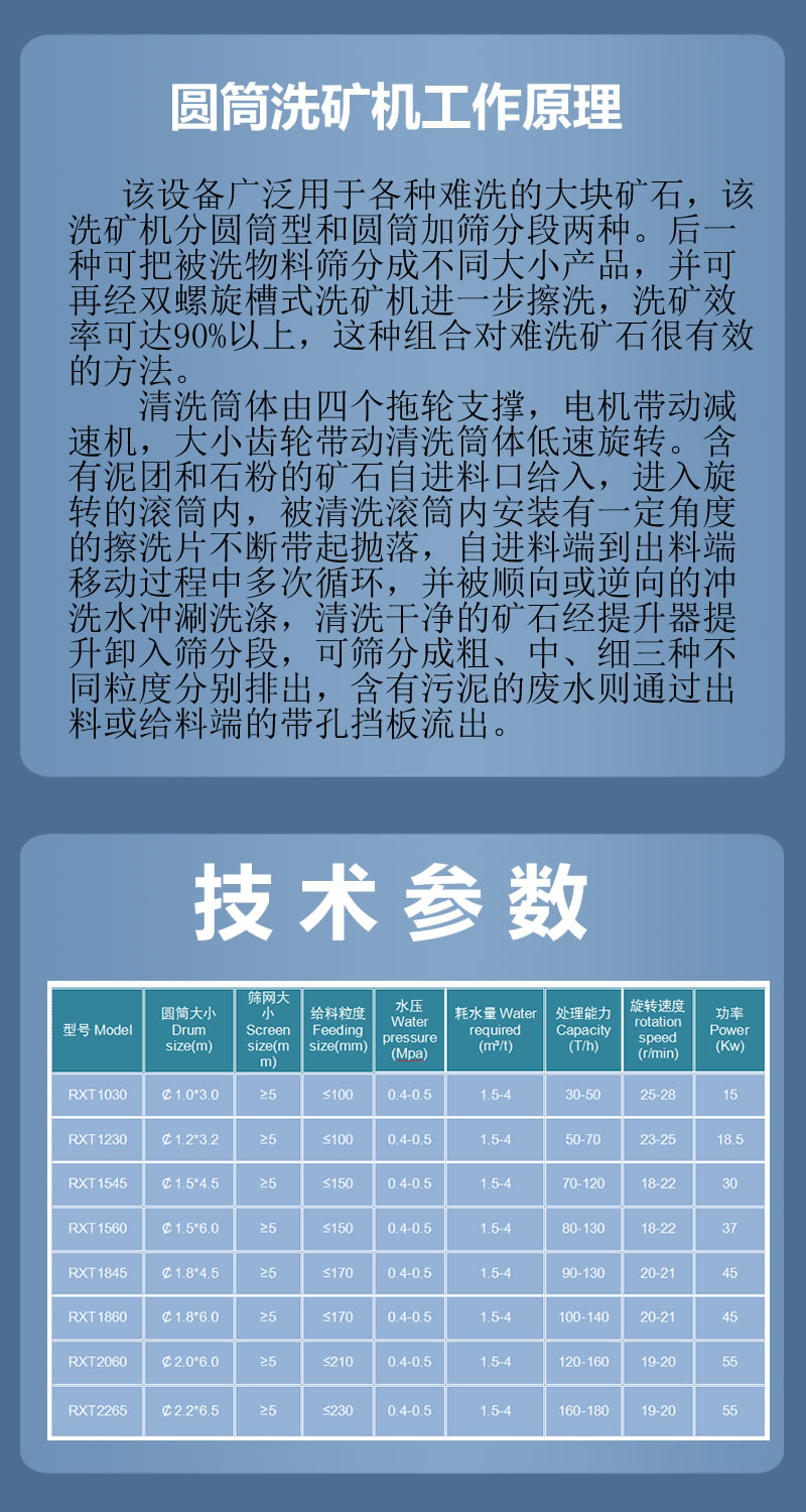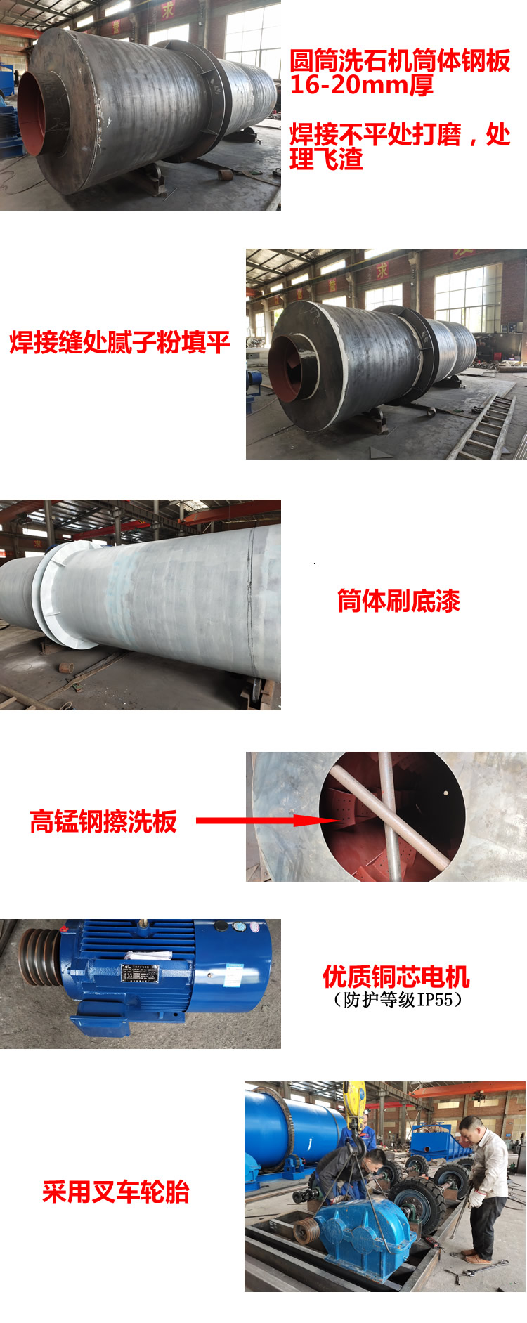 清洗筒體被四個(gè)拖輪支撐,電機(jī)帶動(dòng)減速機(jī),大小齒輪帶動(dòng)清洗筒體低速旋轉(zhuǎn)。含有泥團(tuán)和石粉的礦石自進(jìn)料口給入,進(jìn)入旋轉(zhuǎn)的滾筒內(nèi),被清洗滾筒內(nèi)安裝有一定角度的耐磨橡膠襯板不斷帶起拋落,自進(jìn)料端到出料端移動(dòng)過(guò)程中多次循環(huán),并被順向或逆向的沖洗水沖涮洗滌,清洗干凈的礦石經(jīng)提升器提升卸入雙層錐形篩,分成粗、中、細(xì)三個(gè)粒級(jí)分別排出。含有污泥的廢水則通過(guò)出料或給料端的帶孔擋板流出。