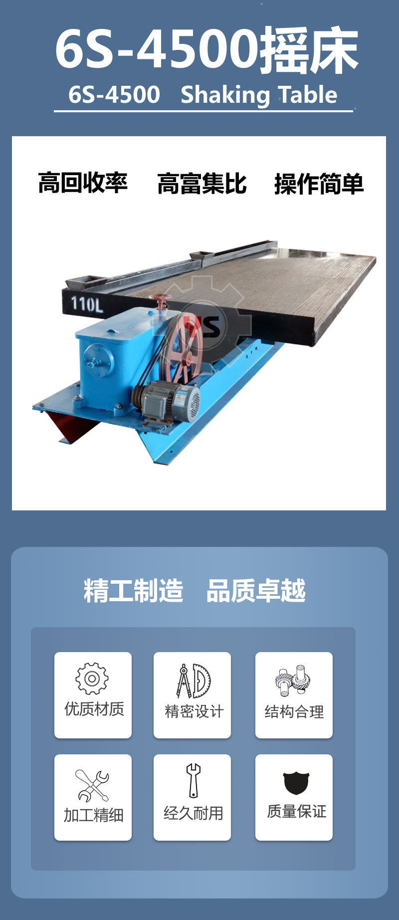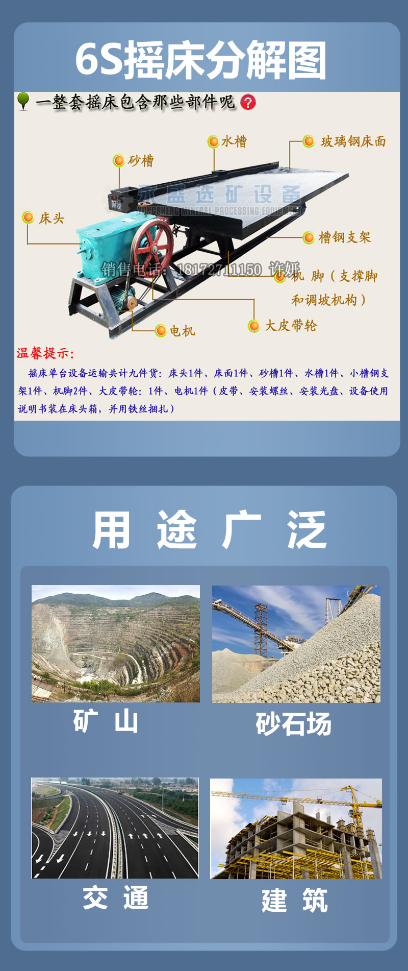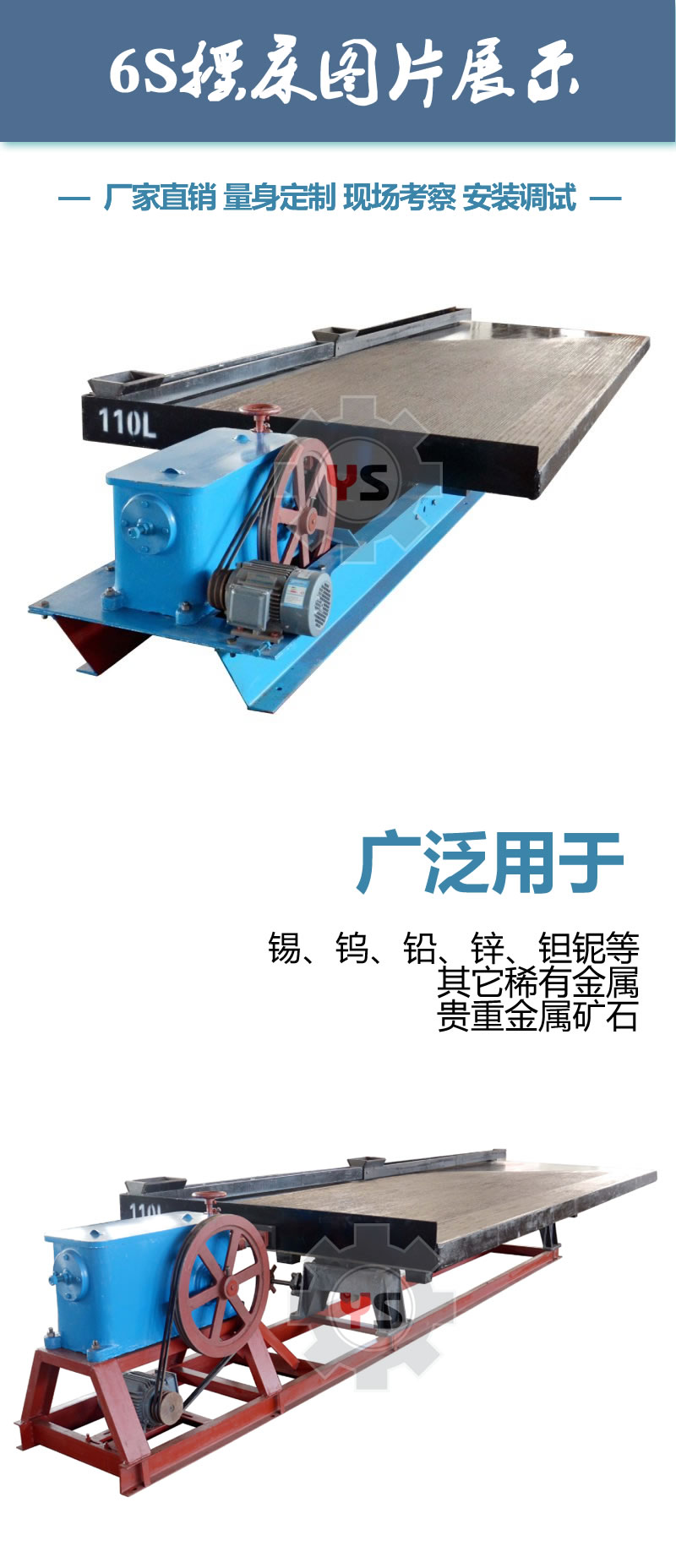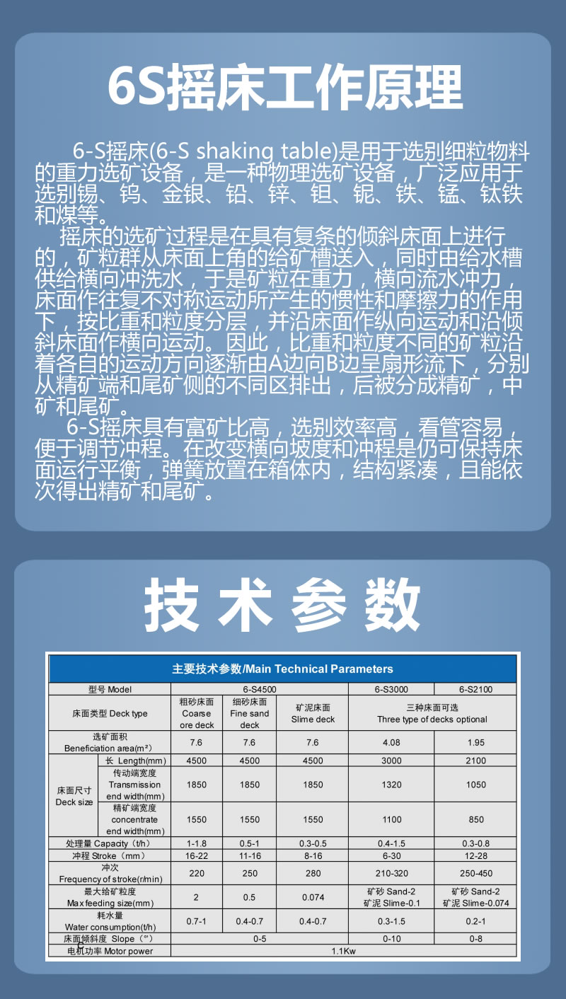 6-S搖床(6-S shaking table)是用于選別細(xì)粒物料的重力選礦設(shè)備,廣泛應(yīng)用于選別錫、鎢、金銀、鉛、鋅、鉭、鈮、鐵、錳、鈦鐵和煤等。